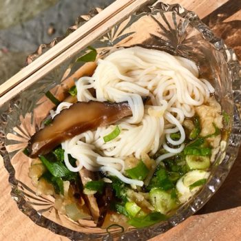 甘く煮た しいたけ、ねぎ、しょうがをたっぷりいれて