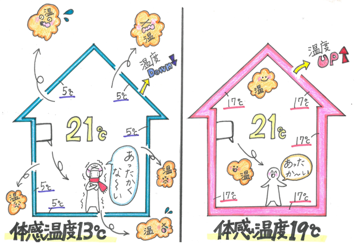 断熱性能は「熱を外に逃さないからあたたかい」だけでなく、「壁や天井、床の表面温度を高く保つからあたたかい」のです。