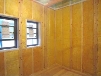 密度は16kgで、105㎜厚の高性能グラスウールを採用し、壁には2重(210㎜)、天井には3重(315㎜)に施工します。