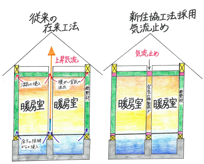 原因が壁の中の上昇気流だとわかって、様々な対策が取られるようになりました。やり方は色々ありますが、要は2つの対策をすれば良いのです。