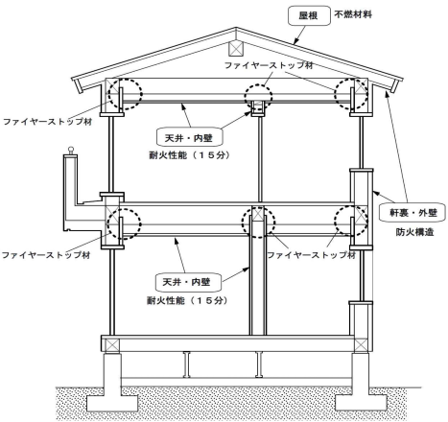 外部からの延焼防止 … 外壁と軒裏を防火構造にし、屋根を不燃材料にする