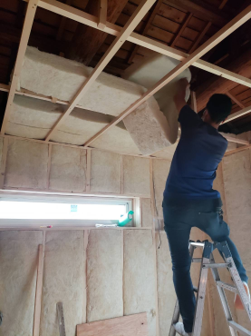 外壁の土壁は解体せずに生かし、内側に断熱材(高性能グラスウール16kg105㎜厚)を施工していきます。