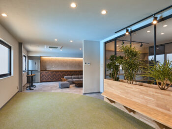 事務室スペースにはスタッフや来客が気兼ねなく交流できる「プランター付きベンチ」を設置しています。